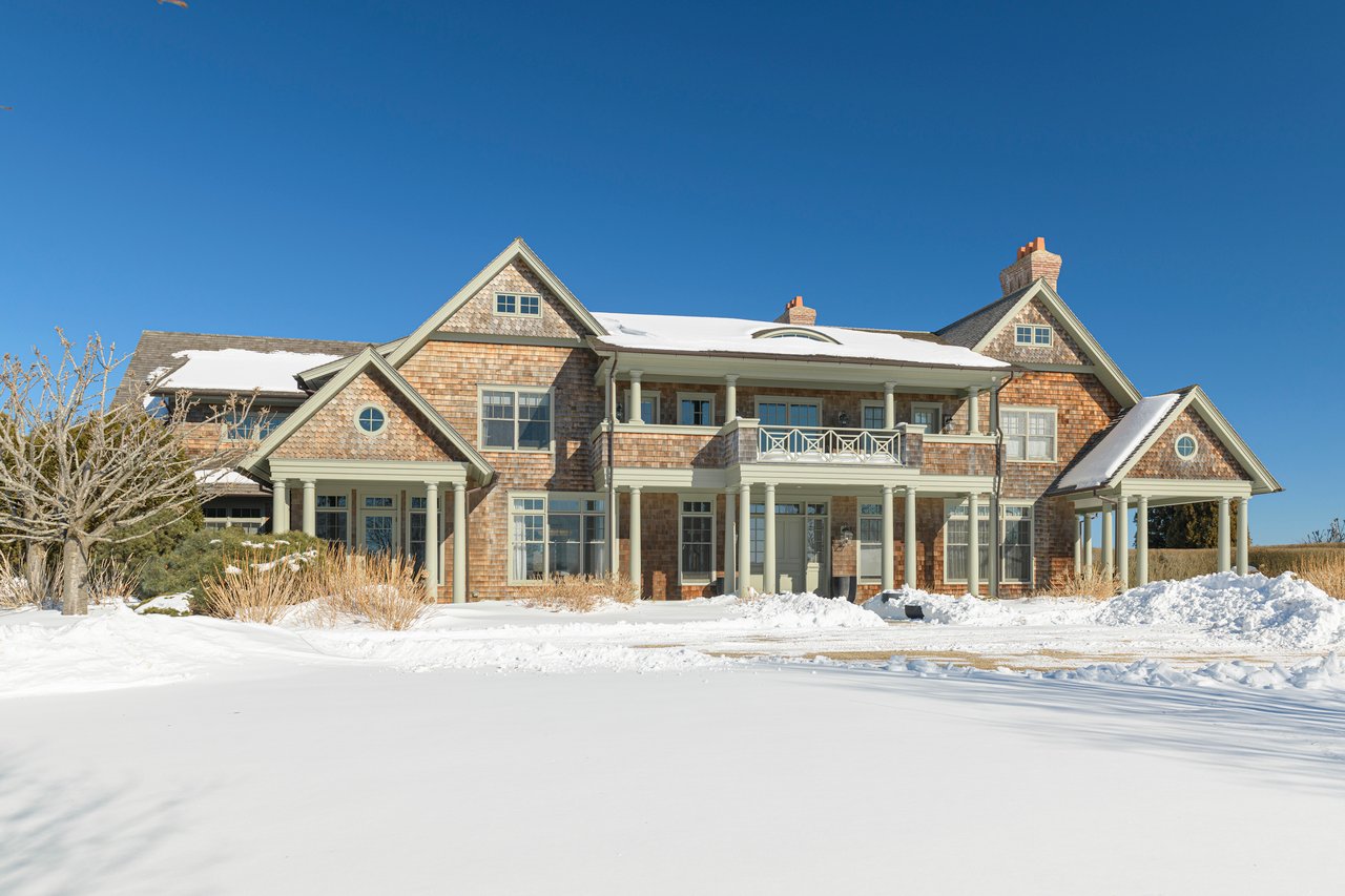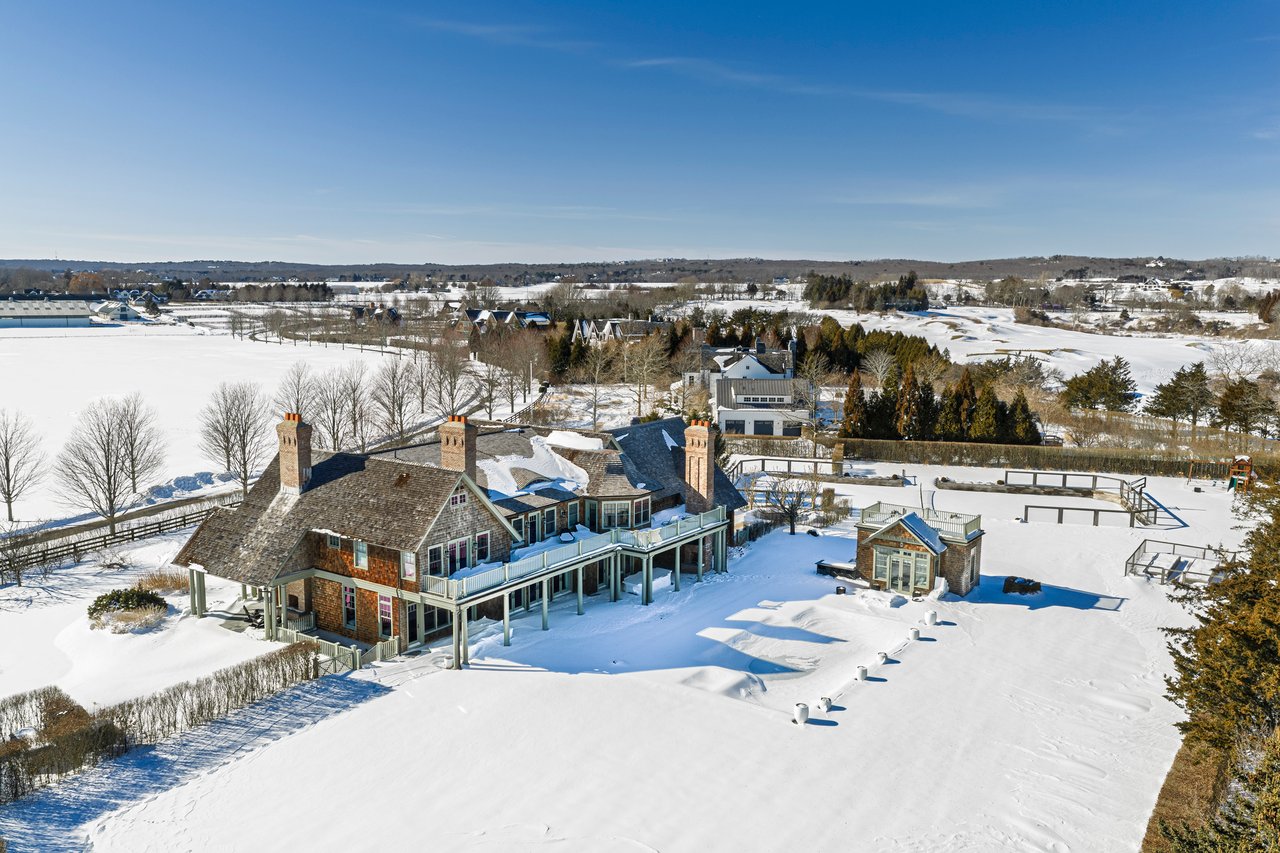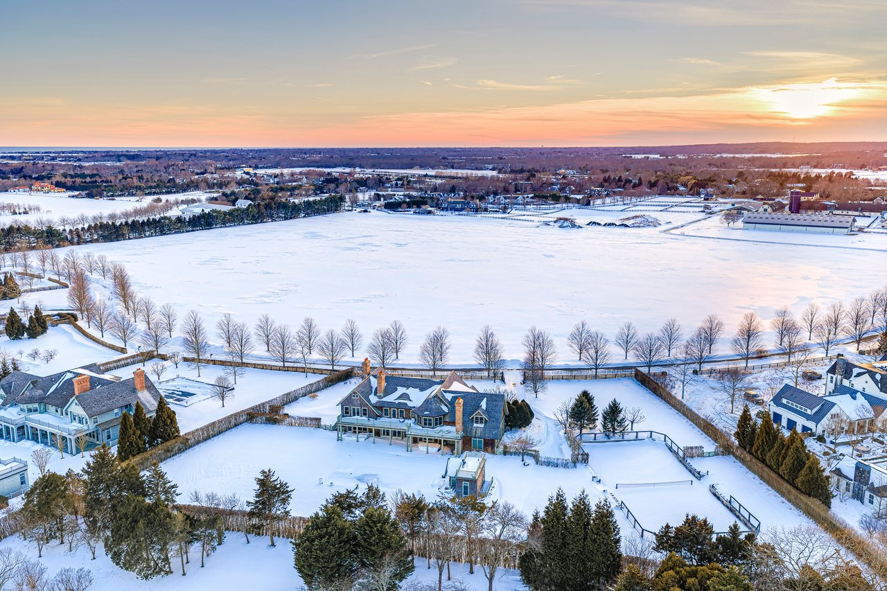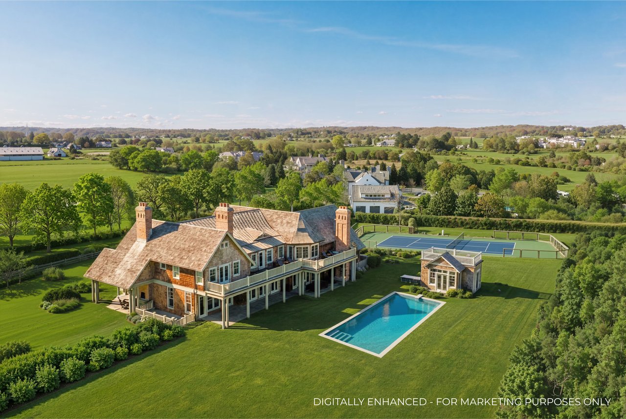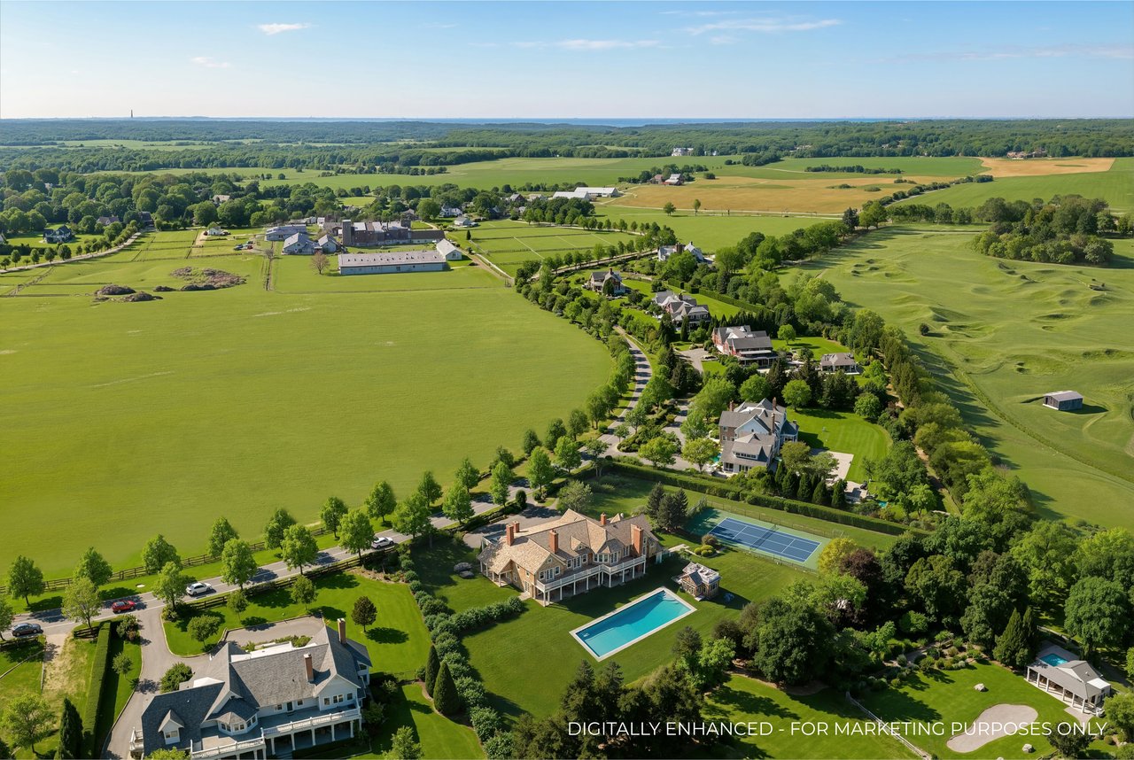 Located on one of the most prestigious lanes in Bridgehampton horse country, this grand home is sited on 1.84 acres with direct western sunset views across over sixty acres of farmland reserve. With interior design by Hamptons favorite Debra Geller, the home features eight bedrooms, eight full and one-half baths, and encompasses nearly 10,000 +/- sq. ft. across three levels, all serviced by an elevator. Upon entering the grand double-height foyer, one immediately feels the scale of the home. A large, open great room centers the entertaining spaces, with casual dining and an oversized kitchen to one side, and a sleek yet cozy den to the other. The formal dining room has direct sunset views across the polo fields, giving the sense of looking out over a vast green ocean. The first floor junior primary suite has its own covered porch, and both indoor and outdoor fireplaces. The second en-suite bedroom on this level may also serve as an office for quieter moments. Upstairs, the generously sized primary suite features an ample sitting room, a large walk-in closet, and an oversized bathroom suite with private terraces. The second level also offers three additional guest suites and one of two laundry centers. Accessed by either staircase or elevator, the finished lower level includes all the amenities one would expect: a large recreation area, wine room, gym flooded with natural light, sauna, theater, and two additional guest bedrooms. Moving outside, the grandeur of the gardens adds to the level of sophistication this property offers. Bathed in sunlight all day, there is more than enough room to experience Hamptons living. Covered porches for dining and relaxing lead out to the 20' x 50' pool with sundeck and inset spa, anchored by the pool house and outdoor kitchen. A full-size sunken tennis court is unobtrusive and set off to the side of the property, with raised produce and flower beds nearby. A true Hamptons classic, centrally located and a perfect East End getaway.