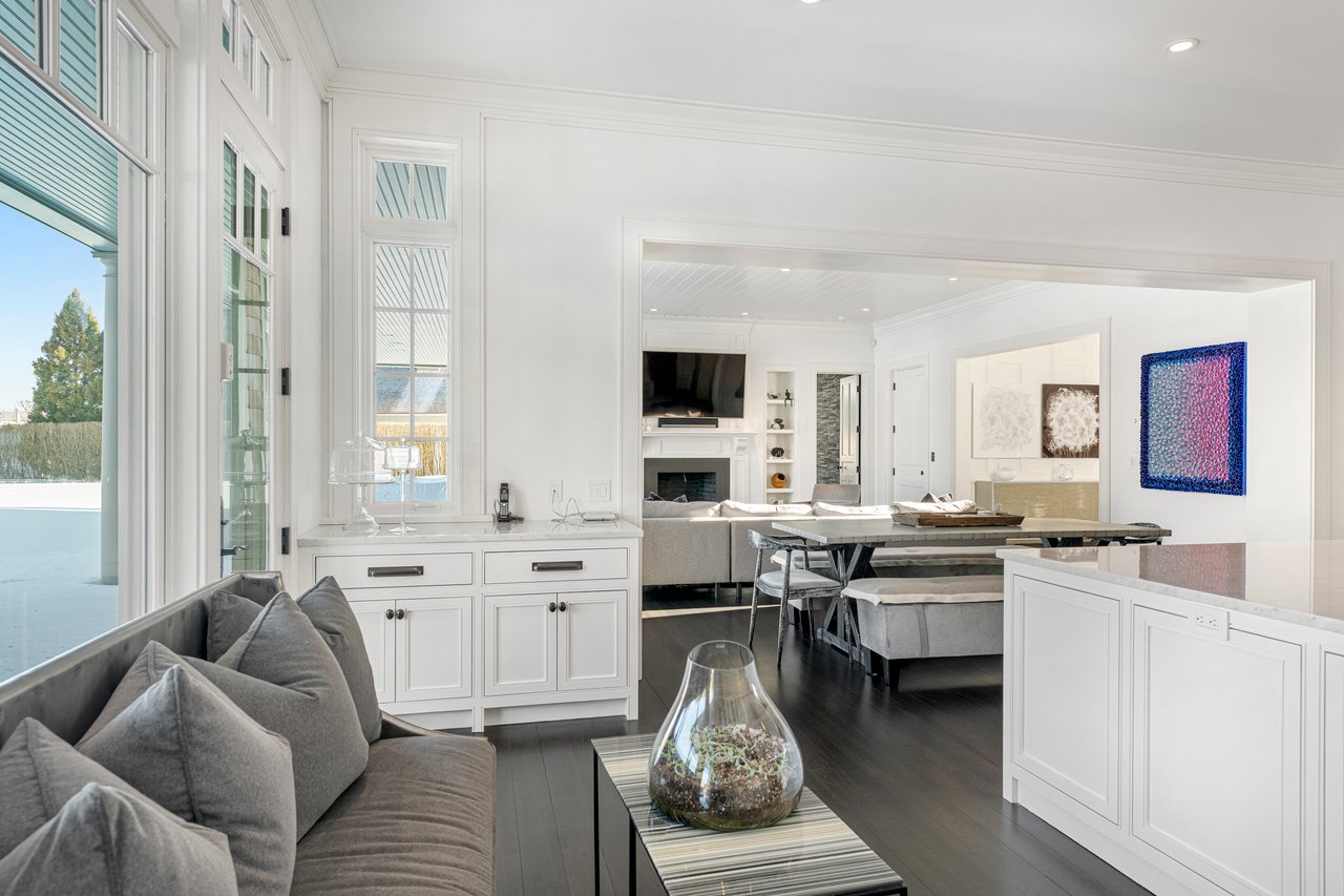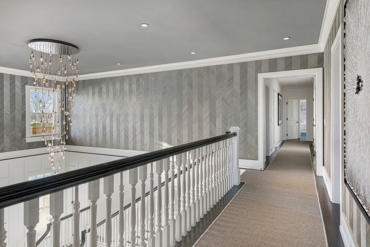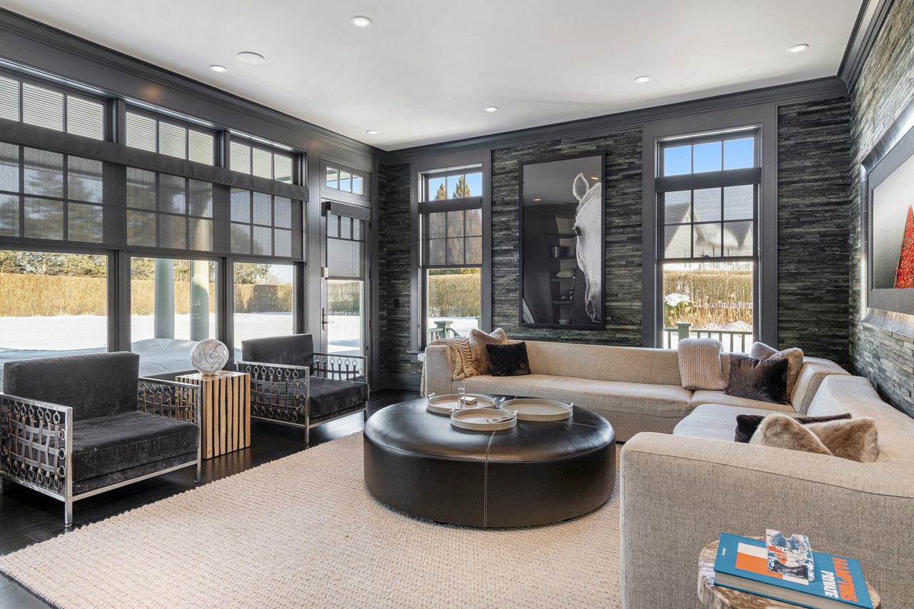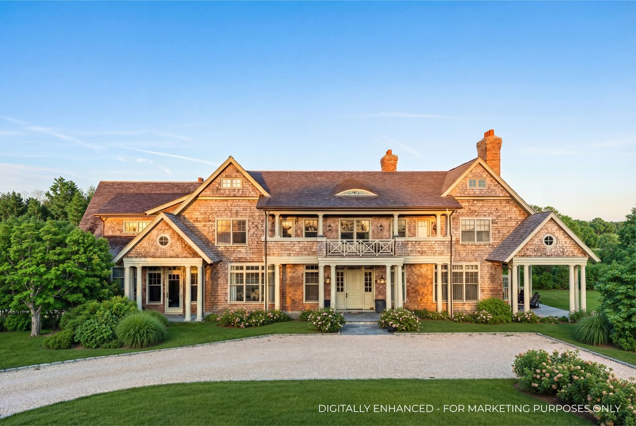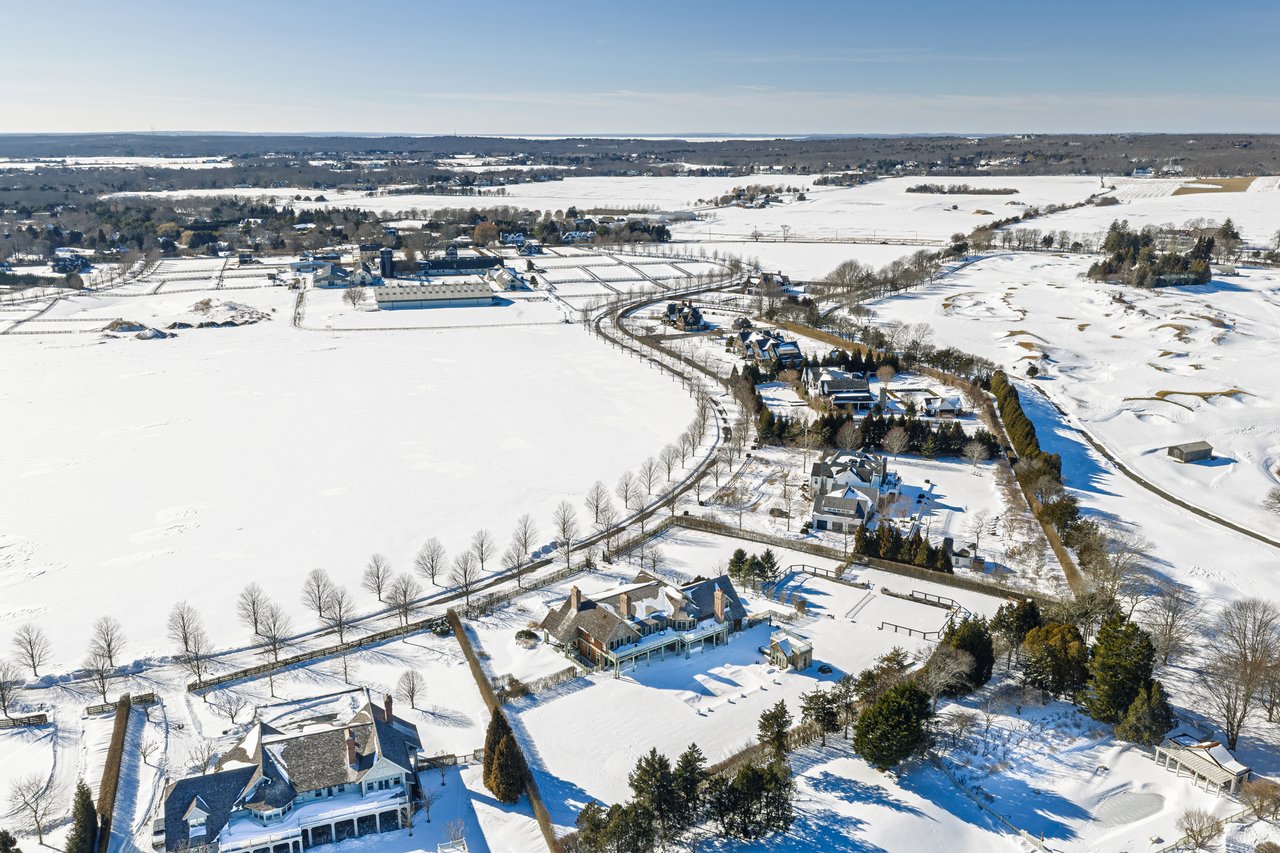 Located on one of the most prestigious lanes in Bridgehampton horse country, this grand home is sited on 1.84 acres with direct western sunset views across over sixty acres of farmland reserve. With interior design by Hamptons favorite Debra Geller, the home features eight bedrooms, eight full and one-half baths, and encompasses nearly 10,000 +/- sq. ft. across three levels, all serviced by an elevator. Upon entering the grand double-height foyer, one immediately feels the scale of the home. A large, open great room centers the entertaining spaces, with casual dining and an oversized kitchen to one side, and a sleek yet cozy den to the other. The formal dining room has direct sunset views across the polo fields, giving the sense of looking out over a vast green ocean. The first floor junior primary suite has its own covered porch, and both indoor and outdoor fireplaces. The second en-suite bedroom on this level may also serve as an office for quieter moments. Upstairs, the generously sized primary suite features an ample sitting room, a large walk-in closet, and an oversized bathroom suite with private terraces. The second level also offers three additional guest suites and one of two laundry centers. Accessed by either staircase or elevator, the finished lower level includes all the amenities one would expect: a large recreation area, wine room, gym flooded with natural light, sauna, theater, and two additional guest bedrooms. Moving outside, the grandeur of the gardens adds to the level of sophistication this property offers. Bathed in sunlight all day, there is more than enough room to experience Hamptons living. Covered porches for dining and relaxing lead out to the 20' x 50' pool with sundeck and inset spa, anchored by the pool house and outdoor kitchen. A full-size sunken tennis court is unobtrusive and set off to the side of the property, with raised produce and flower beds nearby. A true Hamptons classic, centrally located and a perfect East End getaway.