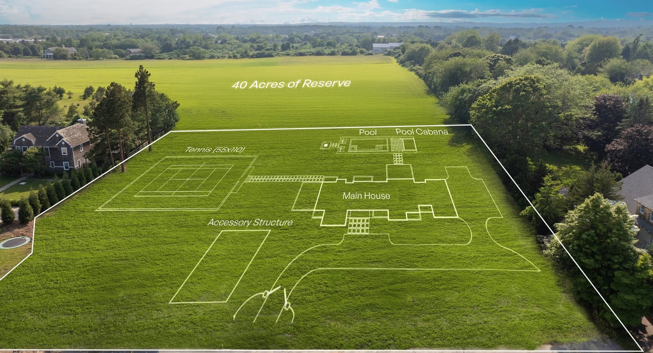 A unique opportunity to live in Bridgehampton on 1.5 acres with 40 acres of west-facing farm reserve views. 372 Lumber Lane is a standout in the Kristen Farrell & Co collection of properties. Powered by the extensive design-build experience of the K&Co development team, this pre-construction opportunity is offered with development plans that include a 12,000 ± sq. ft. main house, 1,500 ± sq. ft. accessory barn with living space, pool cabana, pool, and tennis court. Main house planned features include a private primary wing with expansive views, terrace, fireplace, two closets, and an oversized bath. Features also include seven additional guest rooms with en-suite baths, for a total of eight bedrooms, 9 full and 2 half-baths. The interior highlights include three finished levels, full gym, and a two-car garage. In addition to the main house, the accessory barn offers living space, 1 full and 1 half-bath, and a two-car garage. The outdoor living includes pool, cabana, and tennis court, with landscape design by The Laurel Group. There is over 14,000± sq. ft. of conditioned living space across all three structures on the property. Conveniently located near Bridgehampton village, wineries, stables, and beaches, this is a rare chance to build with open farm reserve views and a full amenity package. Design book and finish samples available. Call for pricing.