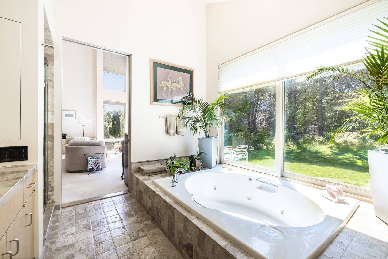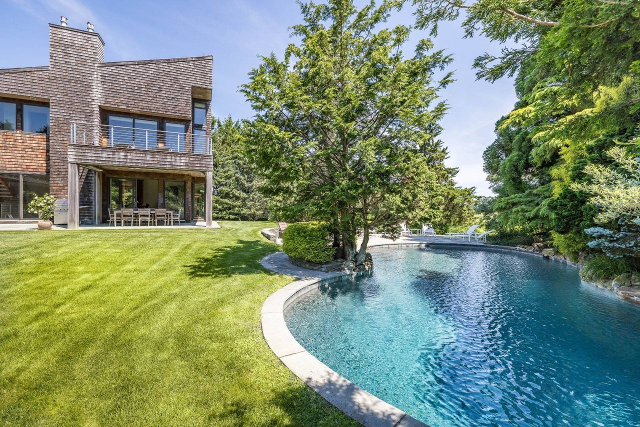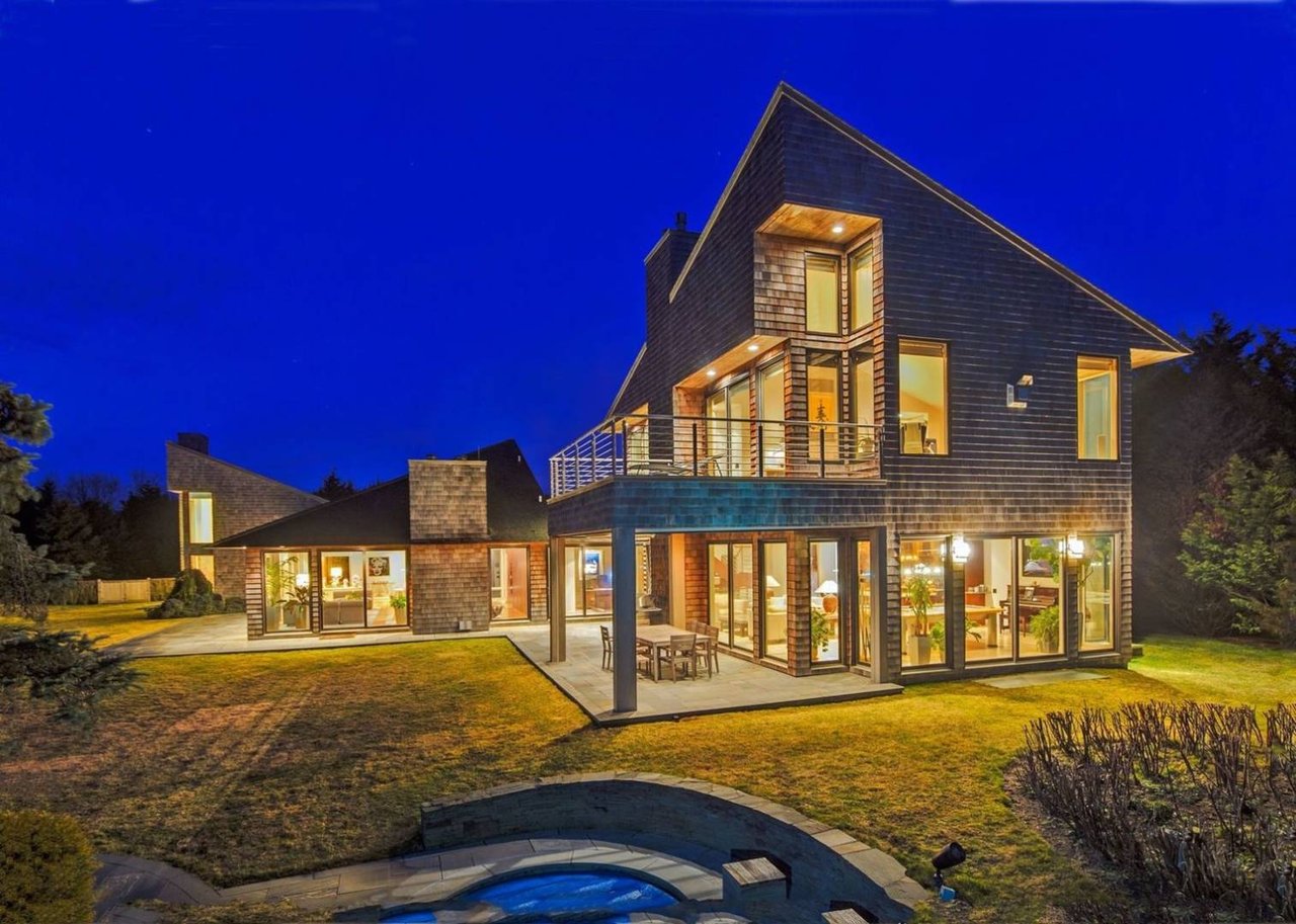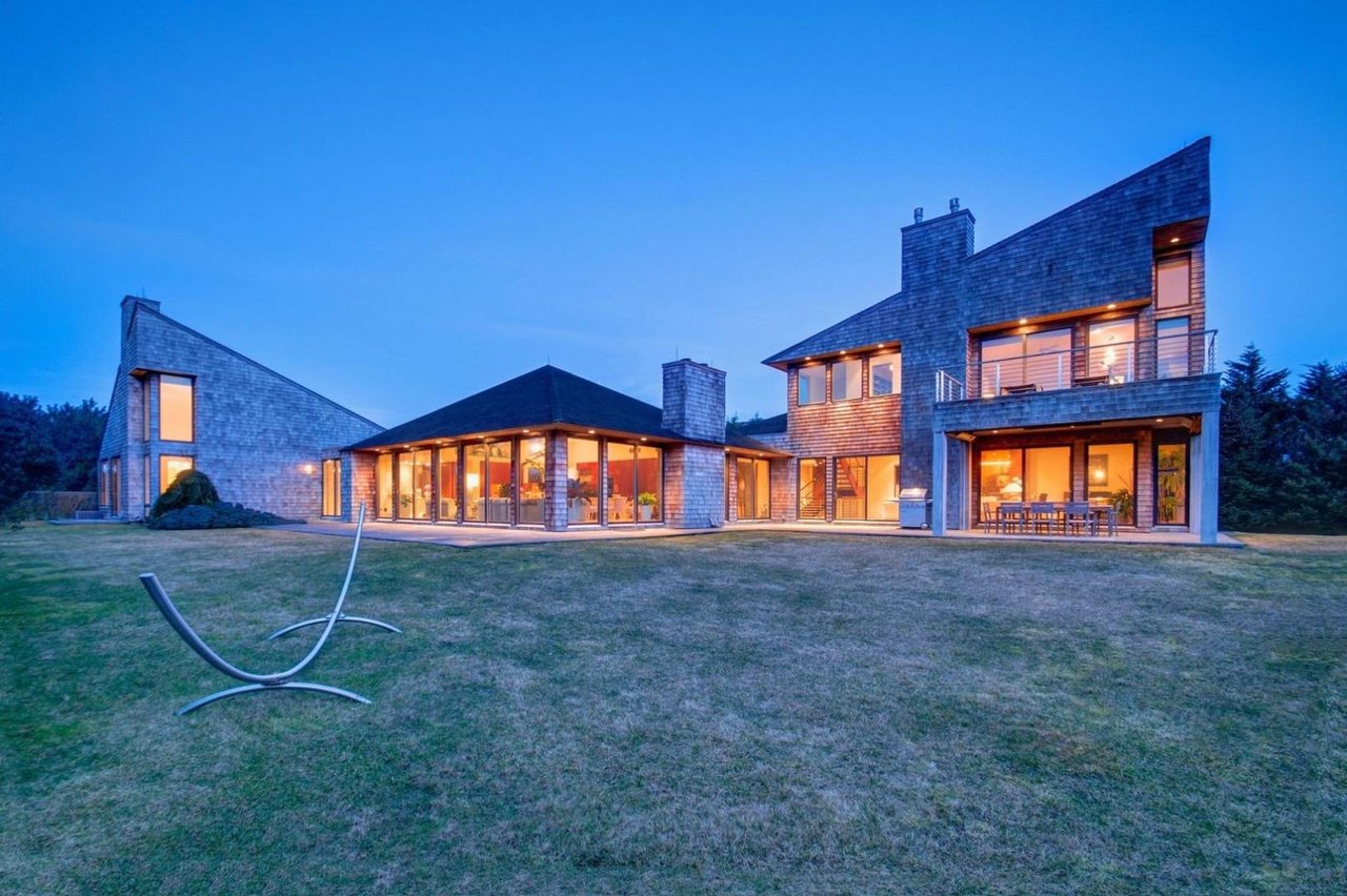 Request InfoOn a very deep 1.57+/- acre flag lot, you discover a truly unique modern home sited amongst mature specimen trees and wildflower gardens. First conceptualized by the acclaimed architecture and design team Tooker-LaFerlita, the home was fully renovated and expanded in 2006 under the direction of John Laffey. Featuring five bedrooms and six baths, the home is light, bright, and blurs the line from indoors to outdoors by use of large walls of glass and double height ceilings. In one wing, you will find an upstairs master suite with private balcony overlooking approximately 20 acres of farmland reserve. On the main level, an open kitchen, formal living, and office space are anchored by a floating staircase, with casual living, recreation space, and full wet bar for entertaining flowing out to outdoor dining with retractable screens. A separate wing accommodates guest bedrooms. In the lower level you will find a fantastic media room, additional bedroom, and full bath. Outside, a freeform pool with waterfall and eight person hot tub are set amongst mature cedar trees, and private spaces to relax abound. With its very close proximity to the beach, this south of the highway estate is a perfect vacation getaway. Available for July-LD 2025 at $225,000.