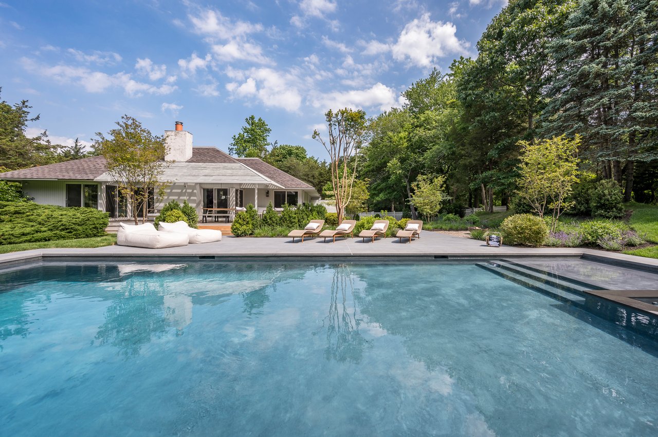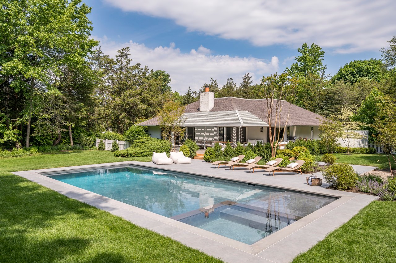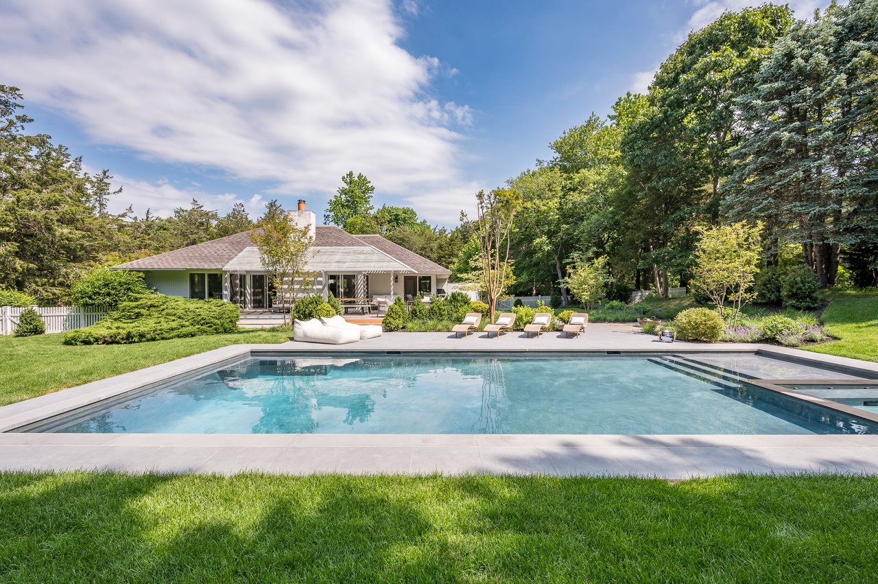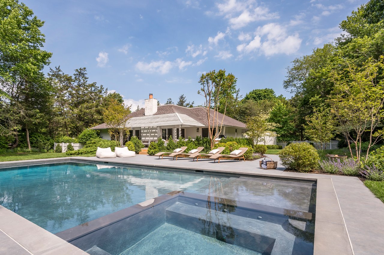 Enjoy this beautifully designed ranch featuring a brand-new Gunite pool with sundeck and spa, set on a lush, landscaped acre offering exceptional privacy. This three-bedroom home was fully redone with luxury finishes, including a vaulted cedar ceiling for a tranquil, beach-inspired feel. The kitchen includes stainless steel appliances, a waterfall granite breakfast bar, and designer-selected details. A bright marble bathroom is accessed through a hidden seamless wooden door, while the primary suite features a walk-in closet, doors to the pool, and an indoor-outdoor shower. The cedar deck wraps around the home with a covered gazebo porch, ideal for entertaining. Conveniently located near Southampton Village, Sebonac Bay Beach, premier golf courses, and transit to NYC.